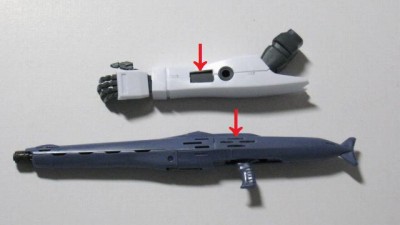腕部、ガンポッド(赤矢印の部分)を開口。